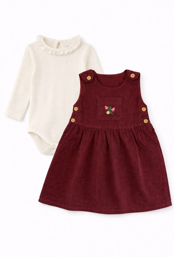 Stylowy i funkcjonalny zestaw, który zapewni maluszkowi wygodę przez cały dzień. Sukienka z miękkiego sztruksu świetnie komponuje się z bluzeczką z długim rękawem ze strukturalnej dzianiny, tworząc praktyczne połączenie na różne okazje. Doskonały wybór zarówno na rodzinne spotkania, jak i codzienne aktywności.