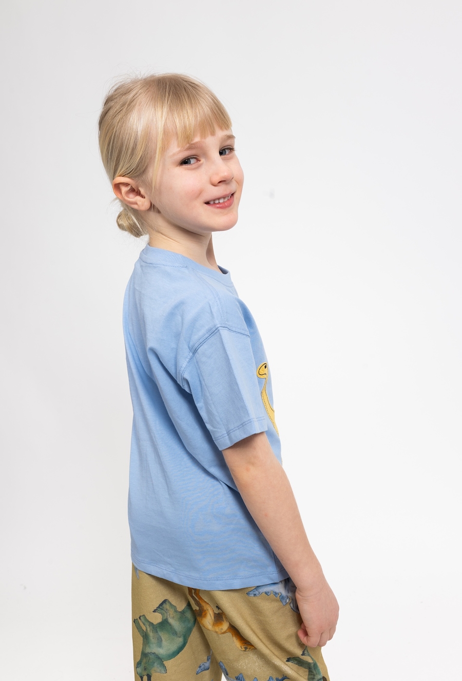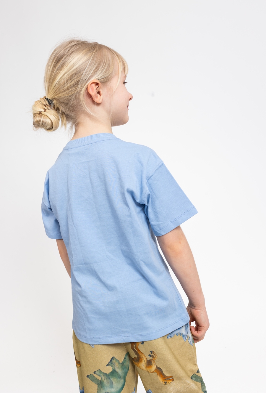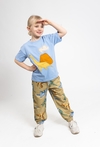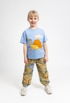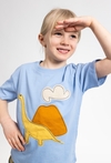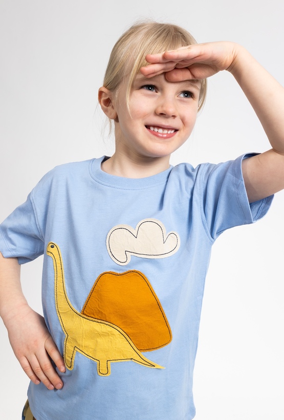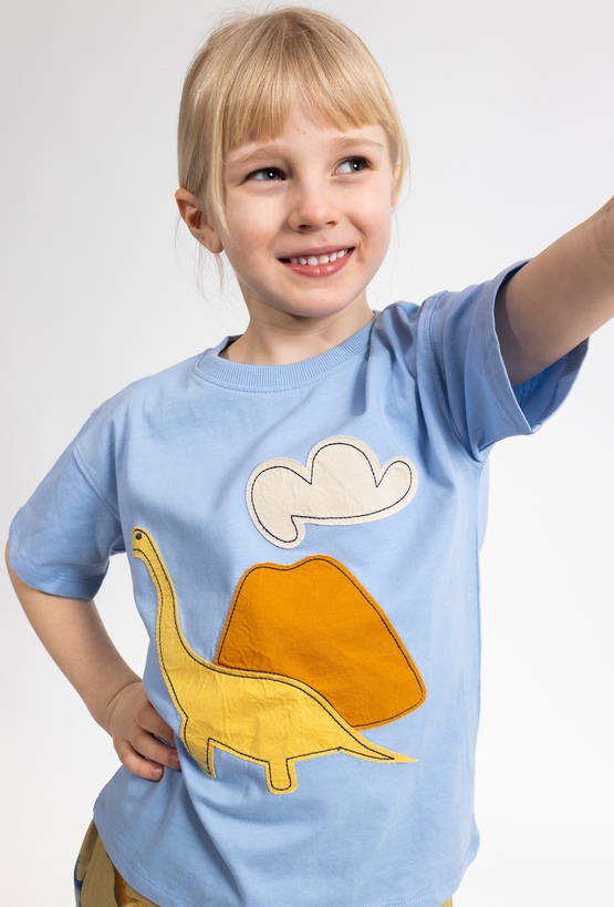 Niebieska koszulka chłopięca z krótkim rękawem to wygodna propozycja na co dzień. Wykonana w 100% z miękkiej bawełny, zapewnia komfort noszenia i dobrą przewiewność. Pudełkowy fason comfort daje swobodę ruchów, a efektowna klejona dekoracja w kształcie dinozaura i wulkanu dodaje stylu i dziecięcego charakteru. Świetnie sprawdzi się do krótkich spodenek, jeansów lub dresów – na plac zabaw, do przedszkola i na wakacyjne wyjazdy.