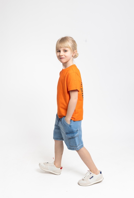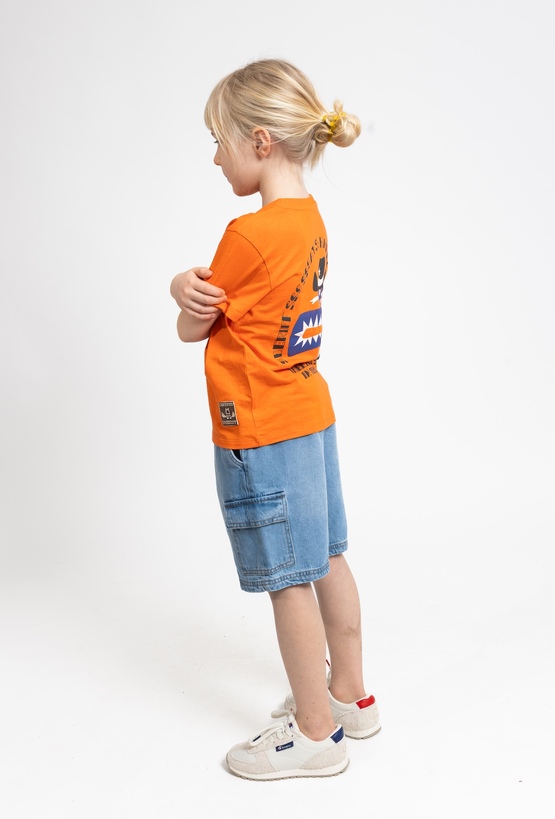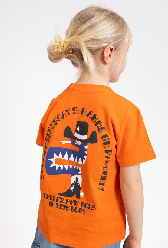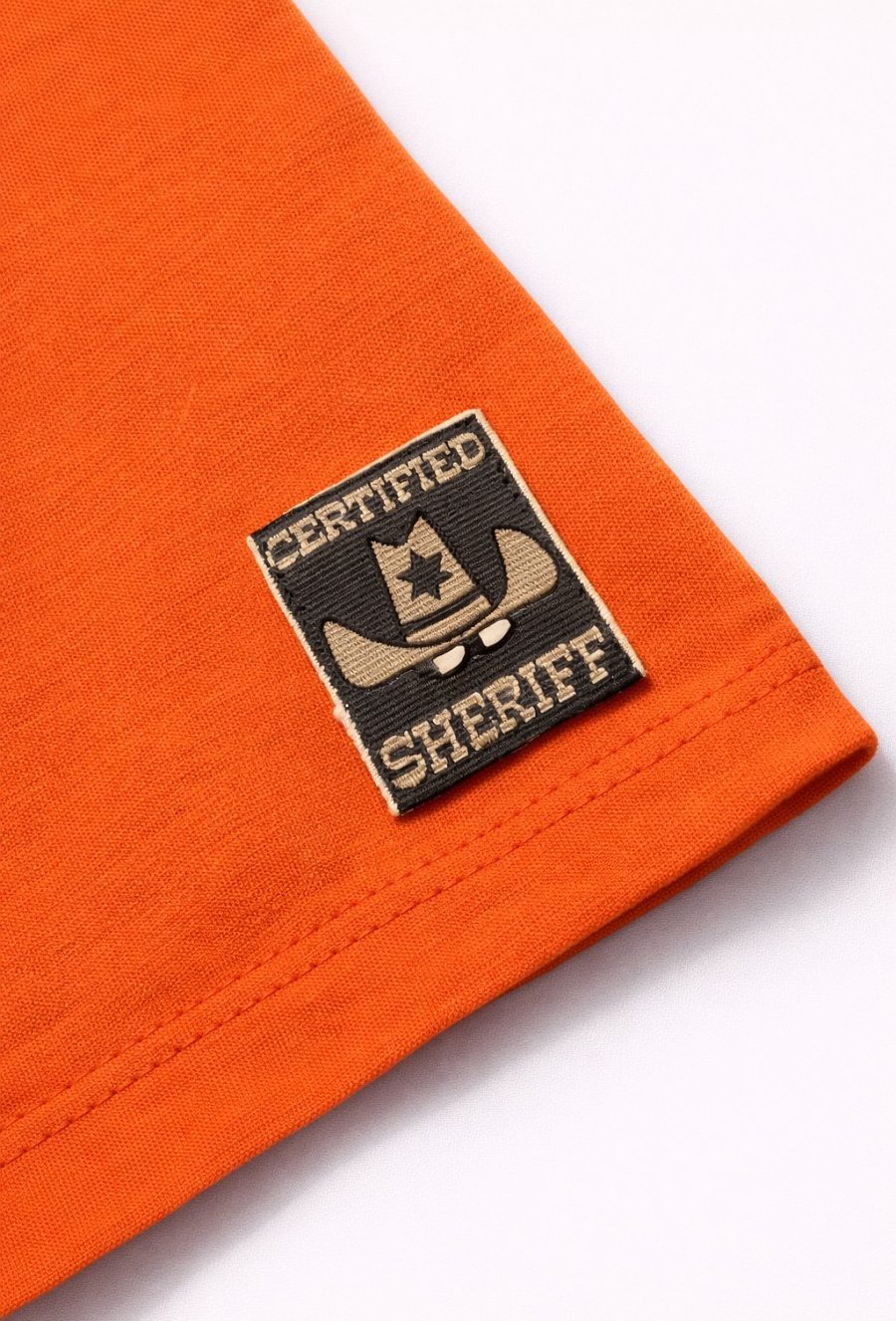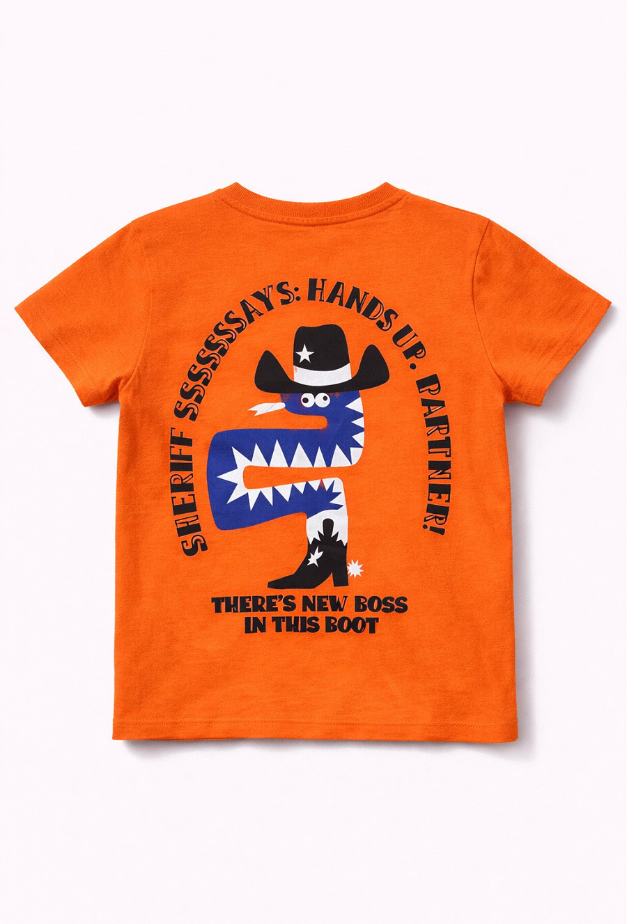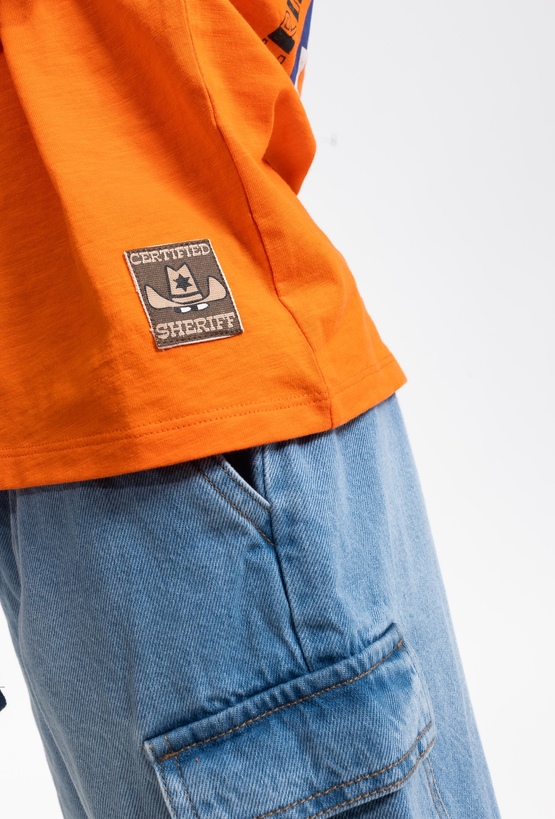 Pomarańczowa koszulka chłopięca z wyrazistym nadrukiem z przodu i na plecach to świetny wybór na co dzień. Uszyta w 100% z bawełny – miękka, przewiewna i przyjemna dla skóry. Klasyczny krój zapewnia wygodę podczas zabawy, a mocny kolor i grafika w stylu „sheriff” dodają charakteru każdej stylizacji.