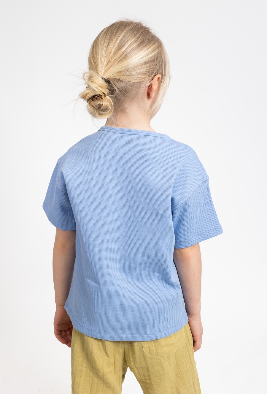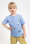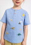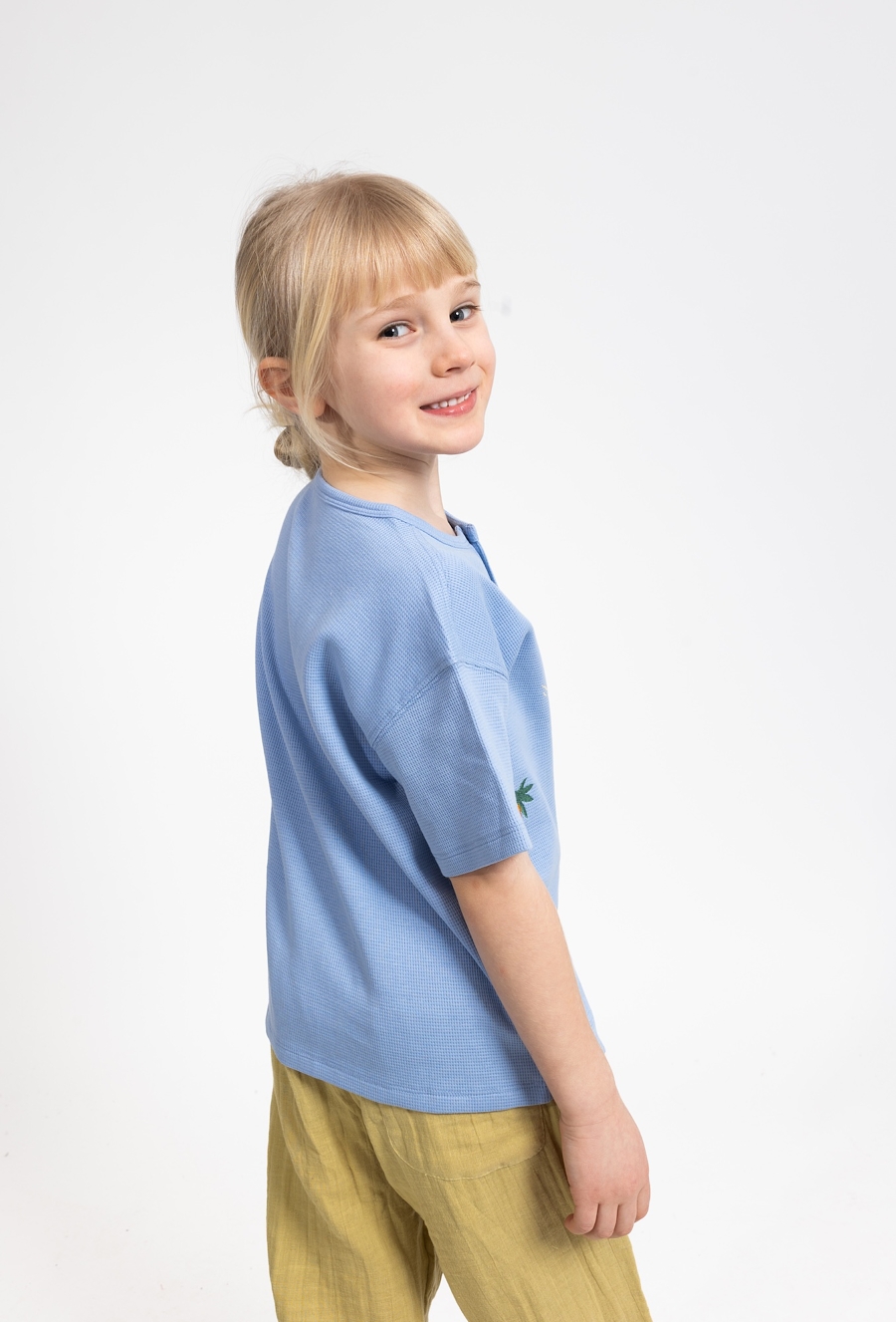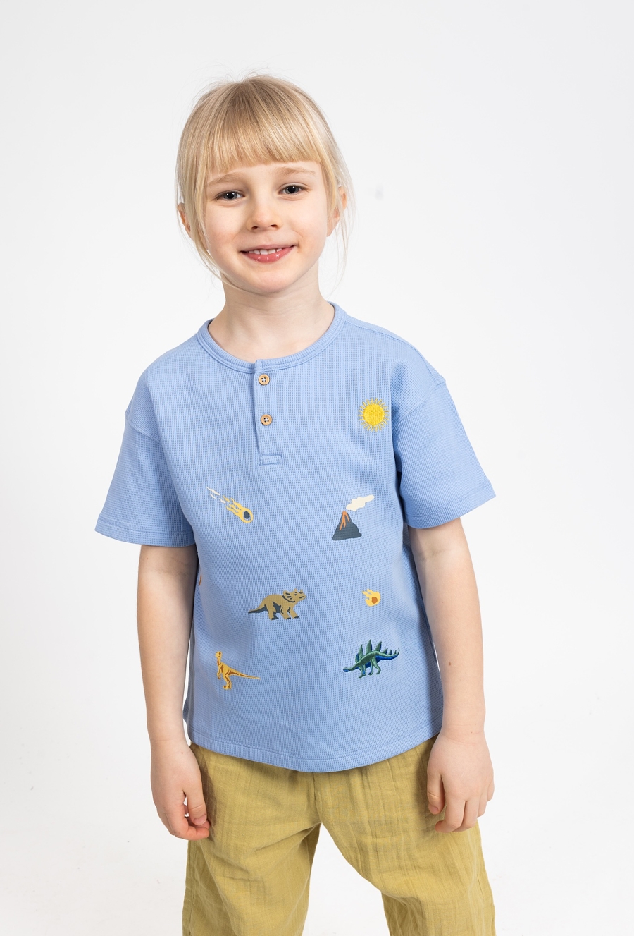 Niebieska koszulka dla chłopca uszyta z przyjemnej w dotyku, strukturalnej dzianiny typu waffle. Luźniejszy krój comfort zapewnia swobodę ruchów, a dodatek elastanu sprawia, że materiał dobrze pracuje i dopasowuje się do sylwetki. Z przodu zapięcie na guziki oraz haftowane motywy dinozaurów, które dodają całości charakteru. Idealna na co dzień – do szortów, jeansów i dresów.