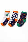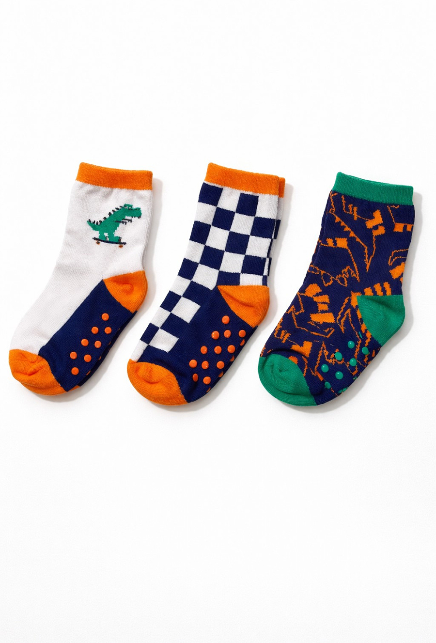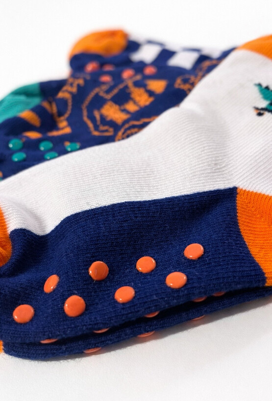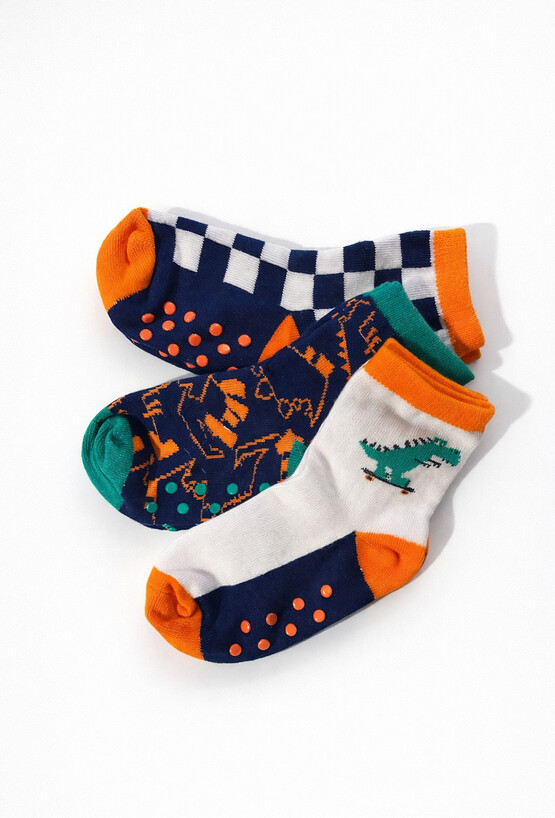 Kolorowe skarpetki antypoślizgowe w 3-paku to świetny wybór do codziennego biegania po domu, do przedszkola czy na wyjazd. Krój do kostki pasuje do sportowego obuwia, a najważniejszy detal to antypoślizgowe kropki na spodzie, które pomagają utrzymać lepszą przyczepność na gładkich podłogach. W zestawie znajdziesz trzy różne wzory: dino na deskorolce, szachownicę oraz graficzny motyw w kontrastowych kolorach granatu, bieli, pomarańczu i zieleni — dzieci je uwielbiają!
