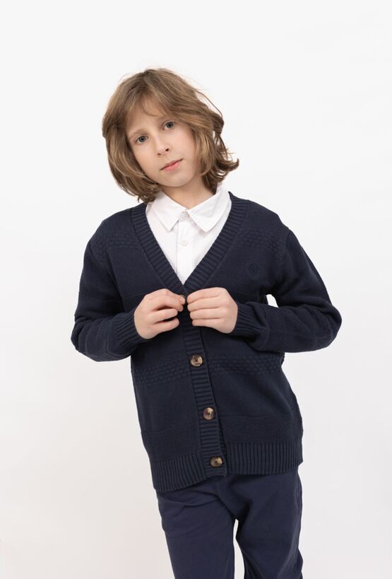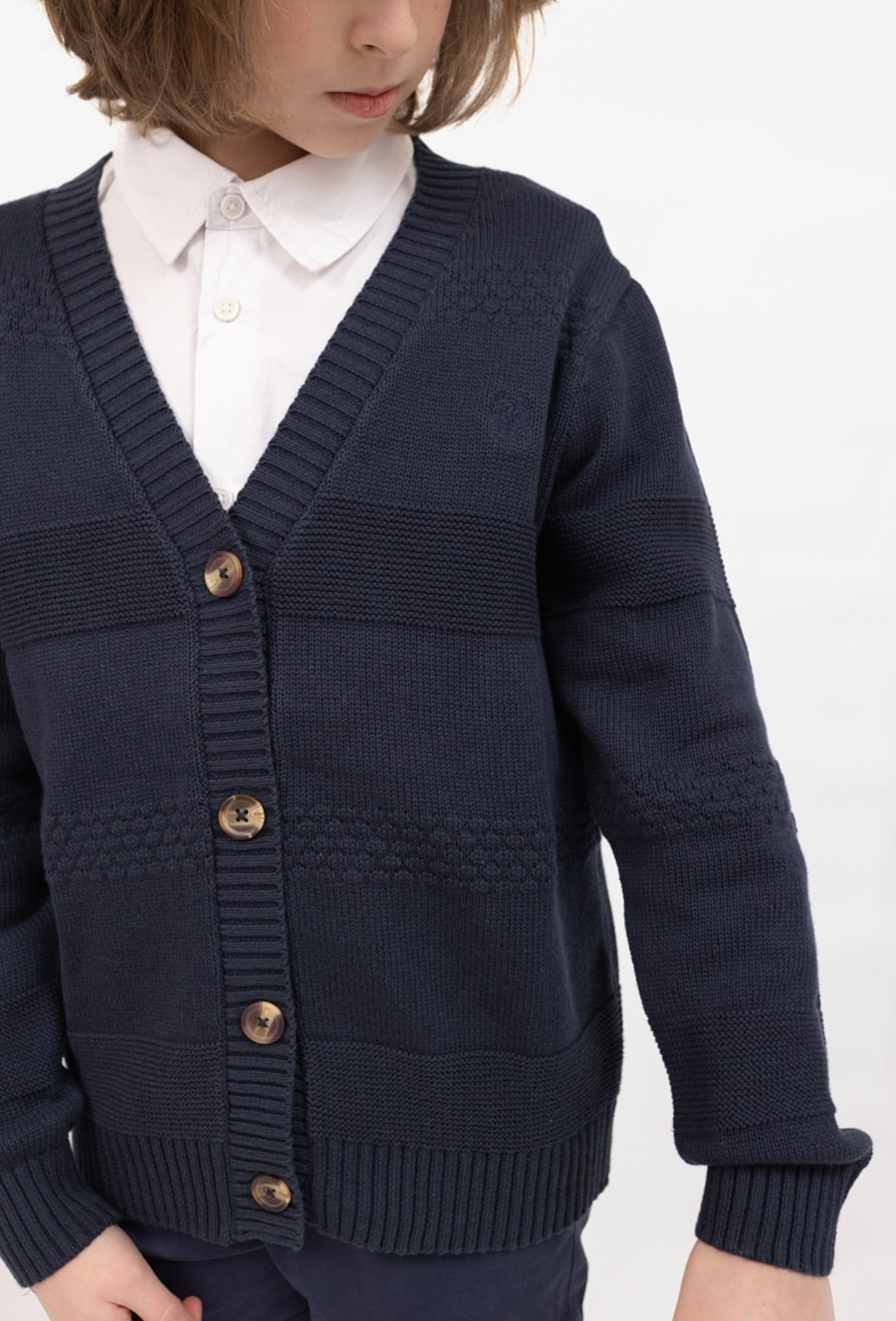 Granatowy kardigan z dekoltem w serek to elegancka, a jednocześnie bardzo wygodna baza do stylizacji szkolnych i „na wyjście”. Model wykonano z 100% bawełny, dzięki czemu jest przyjemny w noszeniu i sprawdzi się przez cały dzień. Sweter ma regularny krój, długie rękawy oraz efektowne nieregularne, żakardowe (strukturalne) pasy, które nadają całości klasy i charakteru. Zapięcie na kontrastowe guziki ułatwia zakładanie, a subtelny monochromatyczny haft i kontrastowa lamówka stanowią dopracowane detale wykończenia.