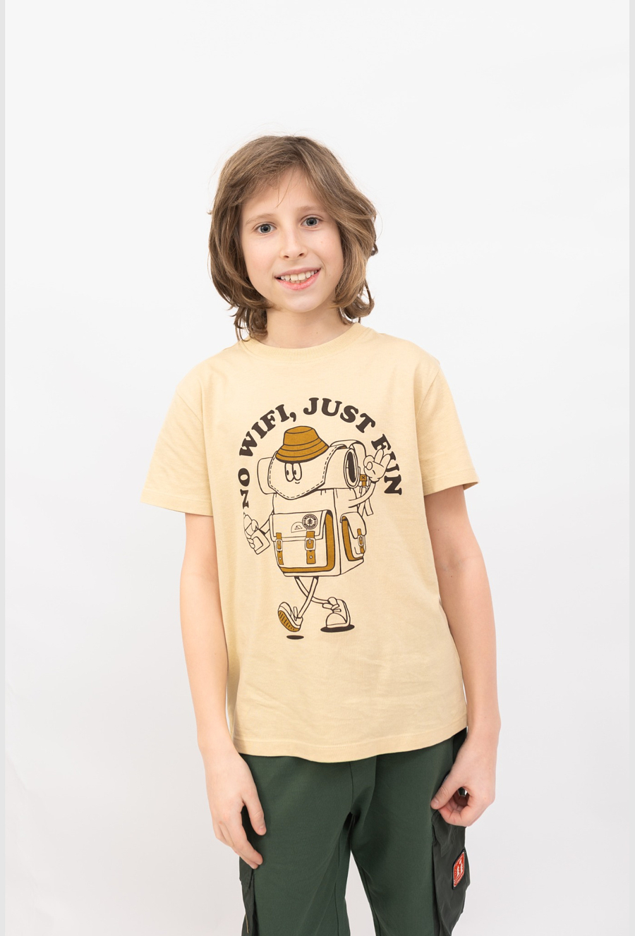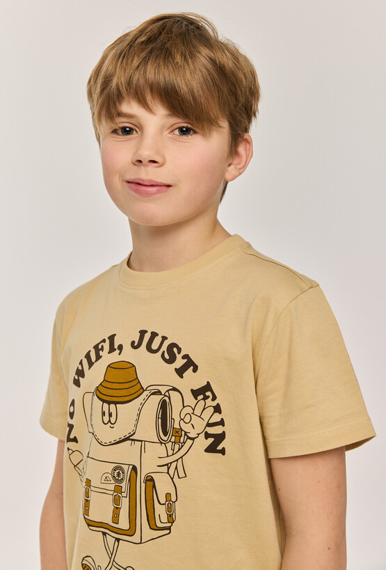 Lekki, wygodny i z fajnym wakacyjnym klimatem. Beżowy t-shirt chłopięcy regular to klasyczna koszulka na co dzień, uszyta z 100% bawełny – miękkiej i przyjaznej dla skóry. Z przodu znajduje się wyrazisty print z motywem plecaka i zabawnym hasłem, który dodaje stylizacji luzu i charakteru. Idealny wybór do szkoły, na spacer, wyjazd i wszystkie aktywne dni.