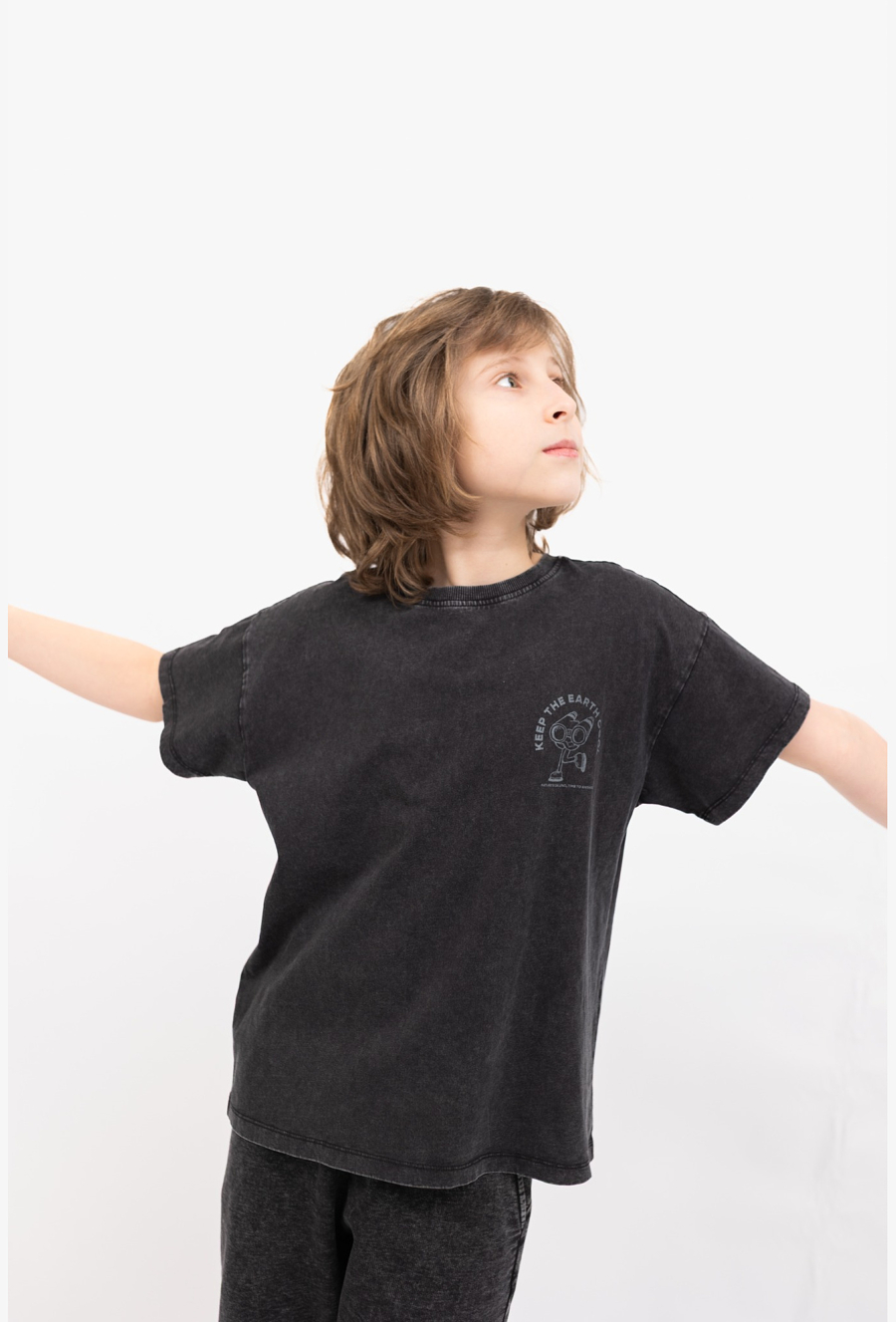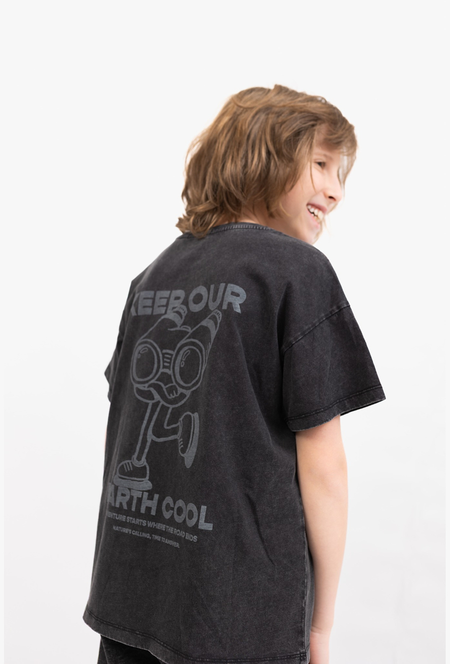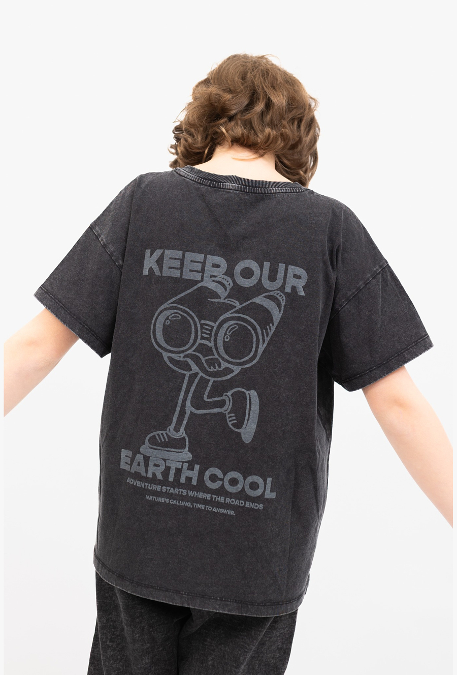 Szary t-shirt oversize to idealny wybór na co dzień. Uszyty ze 100% bawełny, jest miękki, przewiewny i przyjemny dla skóry, a efekt sprania nadaje mu modny, lekko „vintage” charakter. Model wyróżnia się dwoma nadrukami z motywem lornetki – subtelniejszym z przodu i większym z tyłu, dzięki czemu stylizacja od razu nabiera wyrazistości. Luźny krój oversize świetnie wygląda zarówno do jeansów, jak i spodni dresowych.