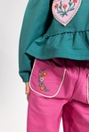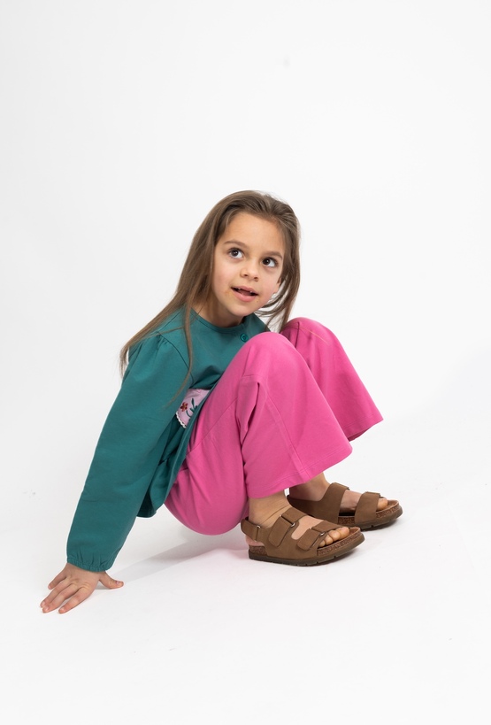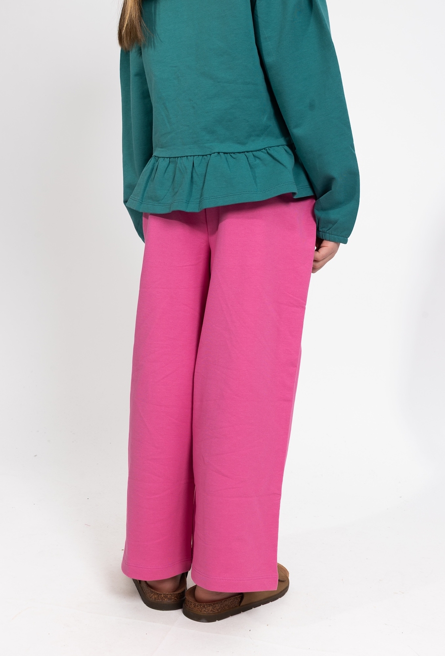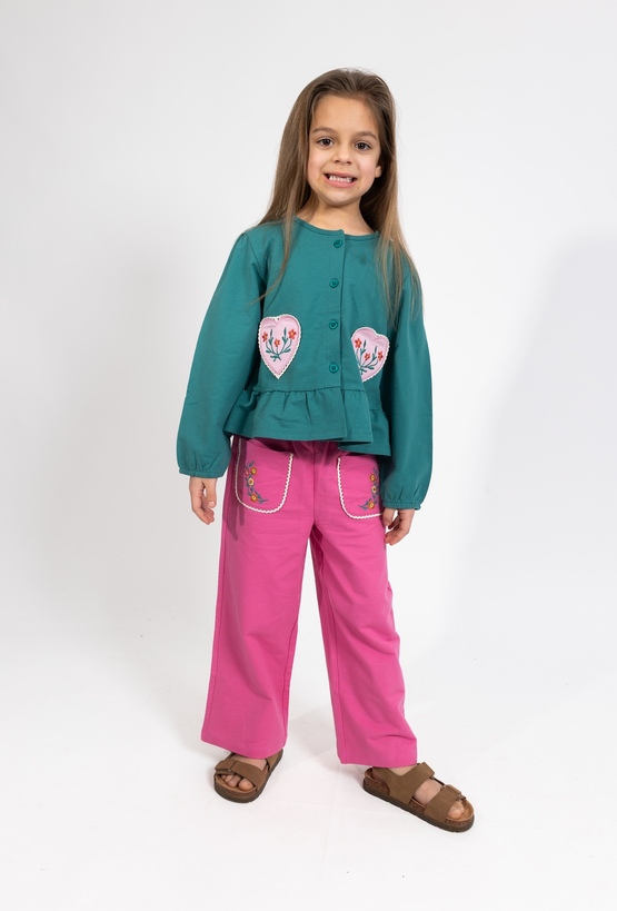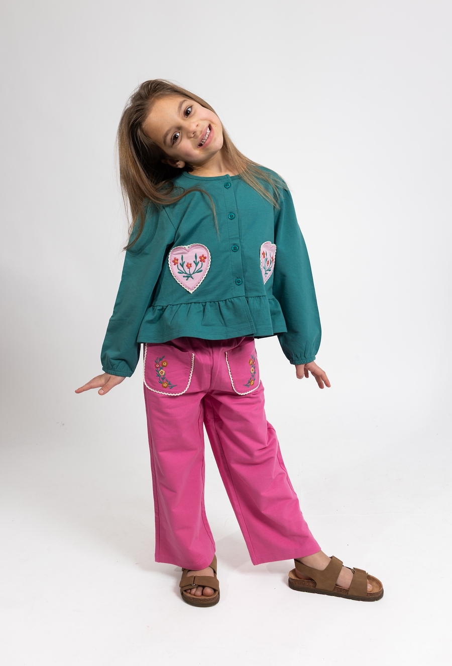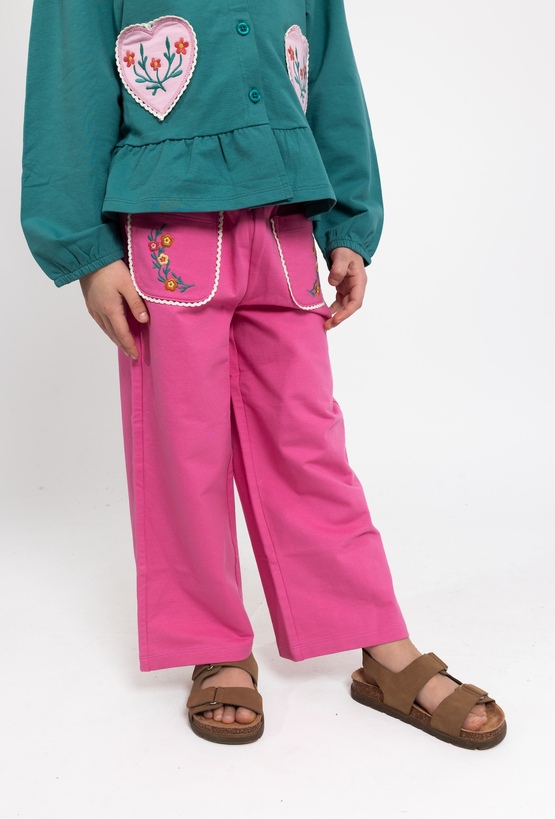 Różowe spodnie wide leg dla dziewczynki to połączenie wygody i uroczego detalu. Uszyte z grubszej, mięsistej dzianiny (95% bawełna, 5% elastan) są miękkie, elastyczne i świetnie układają się na sylwetce. Szerokie nogawki dają swobodę ruchów, a elastyczna gumka w pasie zapewnia komfort przez cały dzień. Uwagę przyciągają dekoracyjne kieszonki wykończone koronką i haftem w kwiatuszki – idealne do stylizacji na co dzień i na wyjątkowe wyjścia.