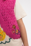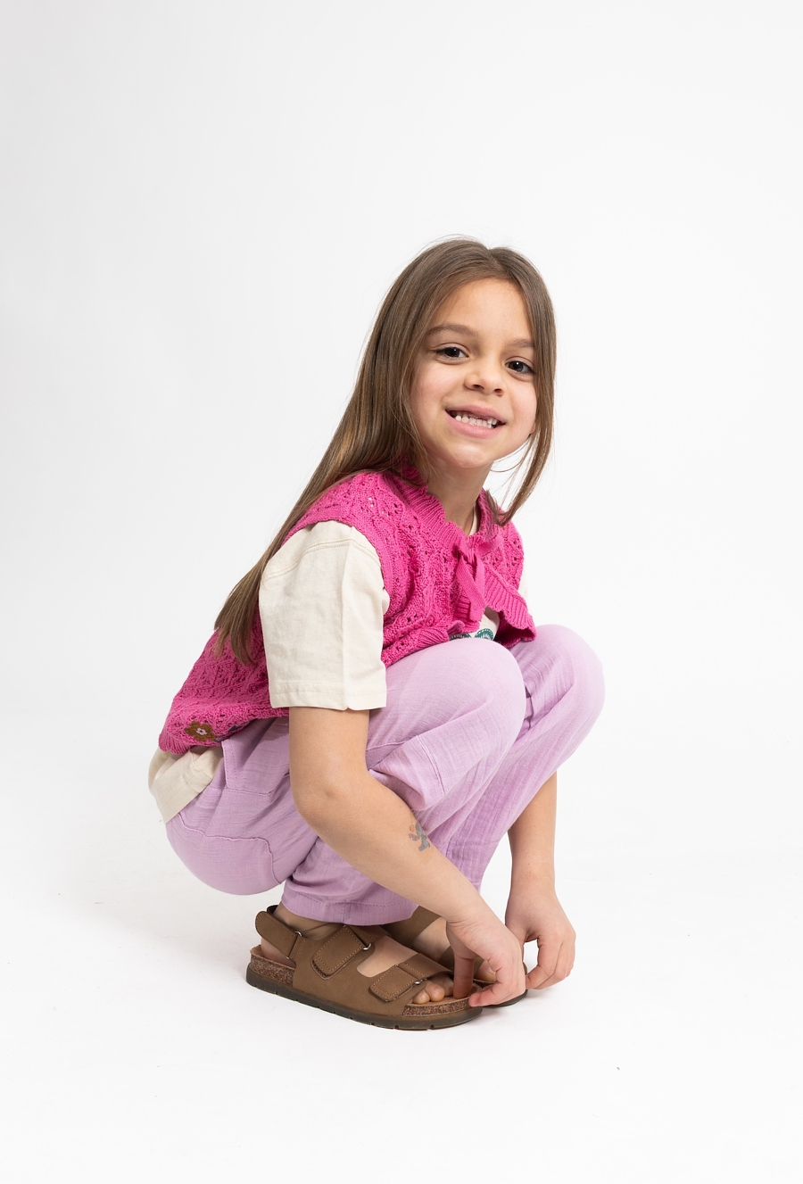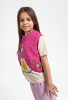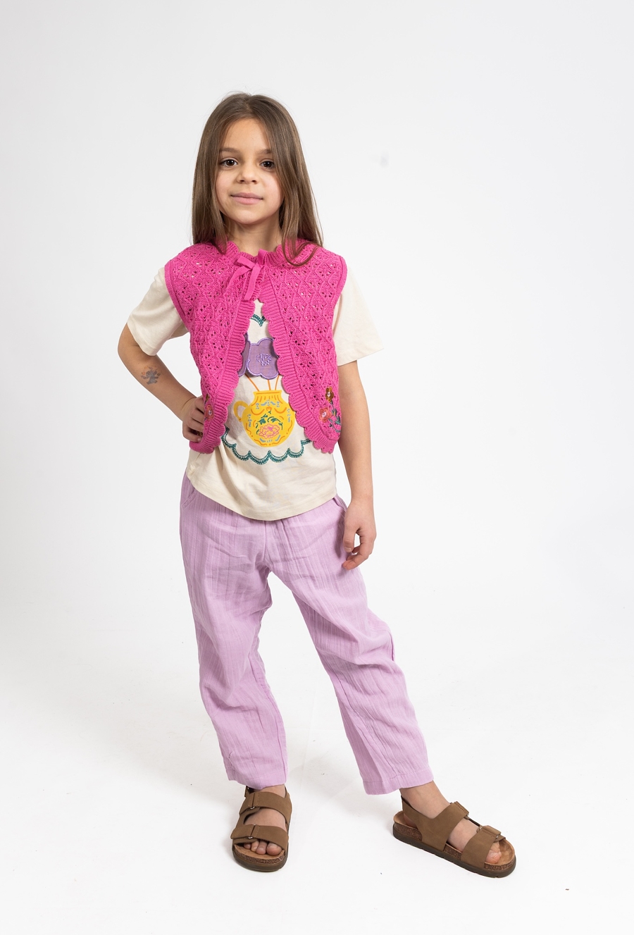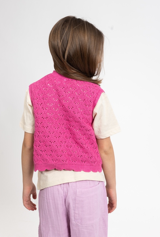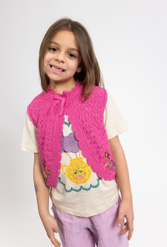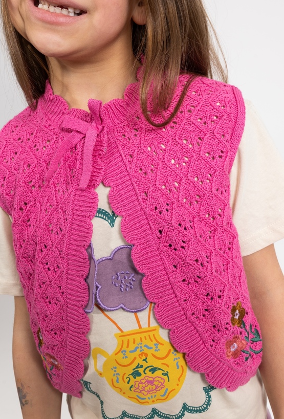 Różowa kamizelka dla dziewczynki z jakości swetrowej, strukturalnej dzianiny to wyjątkowy dodatek do stylizacji na każdą porę roku. Model jest wykonany w 100% z bawełny, dzięki czemu jest przyjemny w dotyku i komfortowy w noszeniu. Wiązanie z przodu nadaje całości uroku, a kwiatowe hafty u dołu pięknie podkreślają dziewczęcy charakter. Kamizelka świetnie wygląda nałożona na T-shirt, bluzkę lub sukienkę.